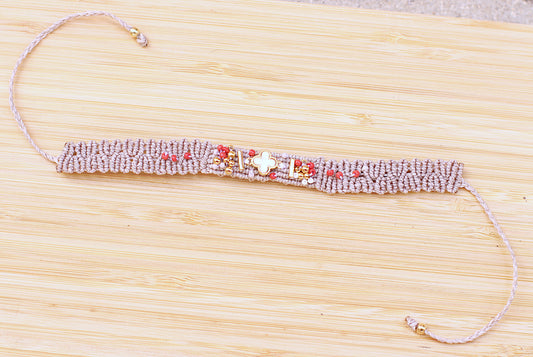 Kaki macramé bracelet with red and gold details