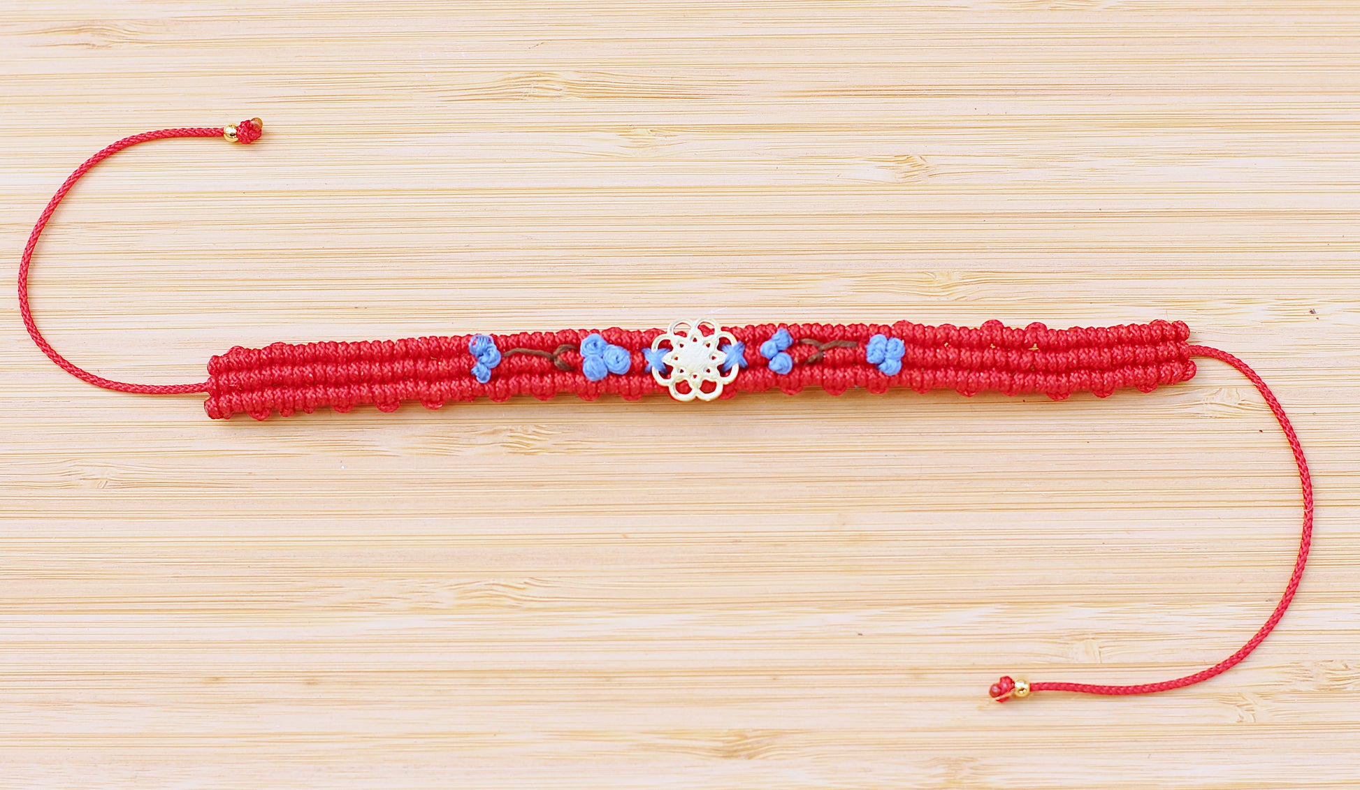 This vibrant red and blue bracelet brings the fun with delicate needle-stitched florals in cool blue tones and a gleaming gold-filled centerpiece that steals the show. Built to last with tarnish-resistant materials, it adjusts to fit your wrist just right—because one-size-fits-most is so last season. Perfect for adding a pop of color to any outfit!