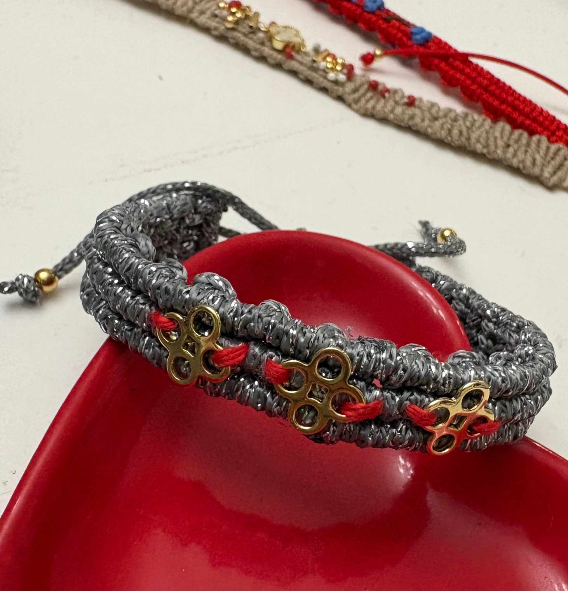 Crafted by hand with playful flair, this trio-toned bracelet weaves together silver cord, gleaming gold-filled accents, and vibrant red in a braided design that won't tarnish. The adjustable fit means it's ready to match your mood—or your outfit. Each piece is uniquely made, so you're getting a one-of-a-kind accessory that's as individual as you are.